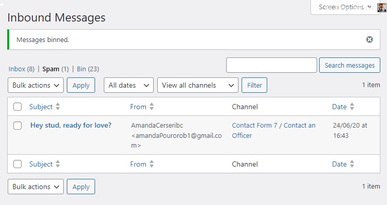 OR click the following URL: https://fparc.uk/wp-admin/admin.php?page=flamingo_inbound&post_status=spam - View the list of messages that have been marked as SPAM.