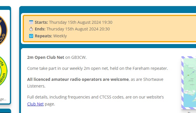 For example: when we didn’t have this feature, we would have had to create 52 duplicate events to have the weekly Bramble Net scheduled in the Events Diary. That’s impractical. Now we can create just the one Bramble Net event post, and have the event move itself across the Events Diary periodically.