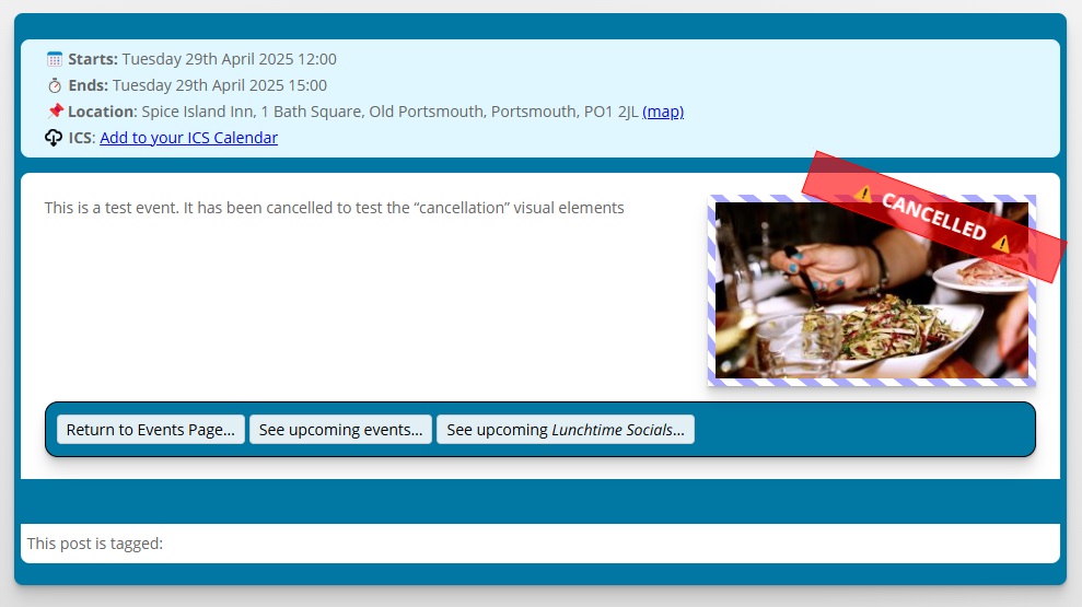 Deleting an event from the website when it has become cancelled may not communicate the cancellation to all of your intended audience, possibly resulting in people turning up to the event anyway, or sending emails asking “this event on my phone… is it still on?”